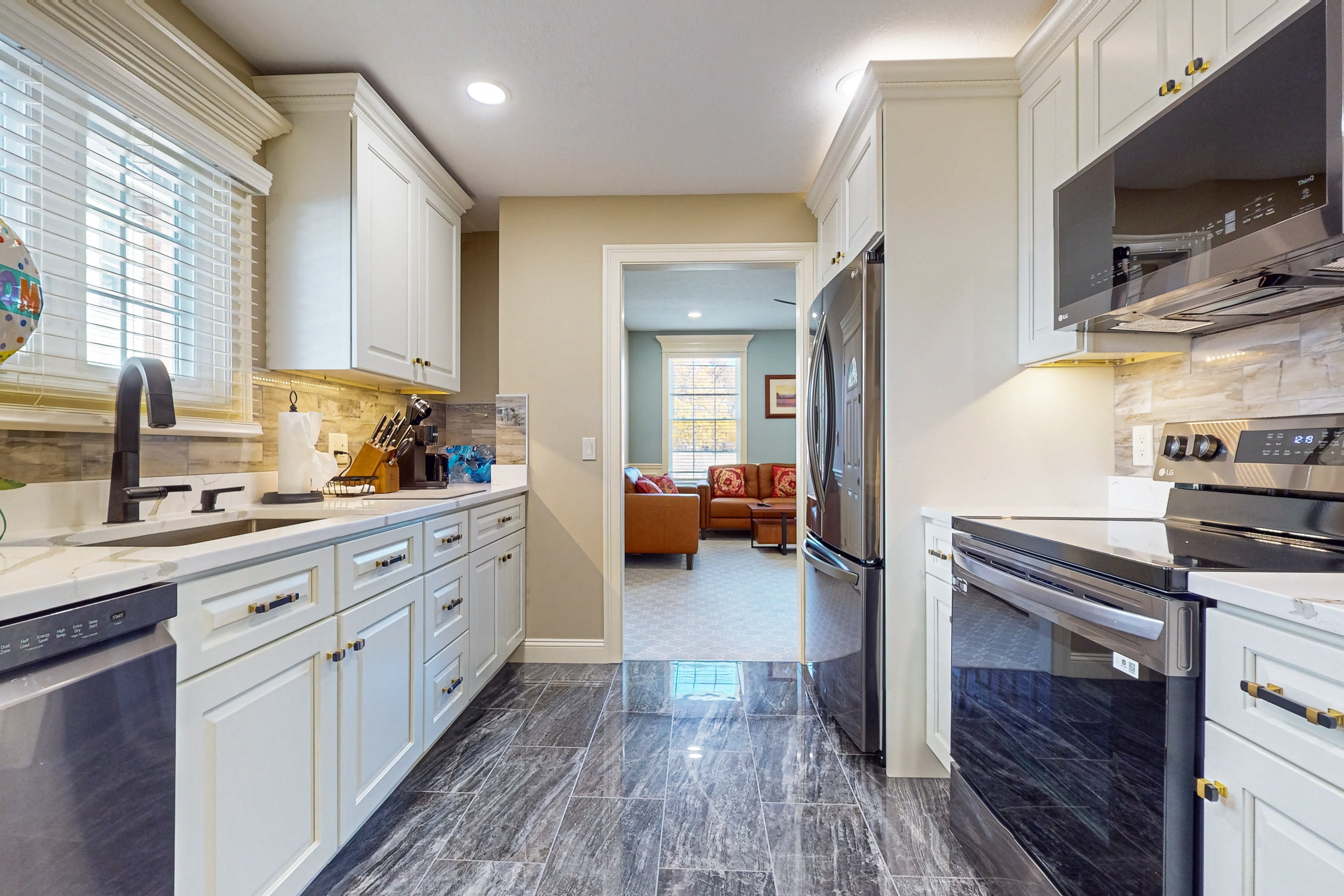 Very well appointed with a large living space. Coffee and soda were provided and that was a nice touch. Clean with a very comfortable bed. Washer and dryer was very handy. This place is actually nicer than the pictures show.